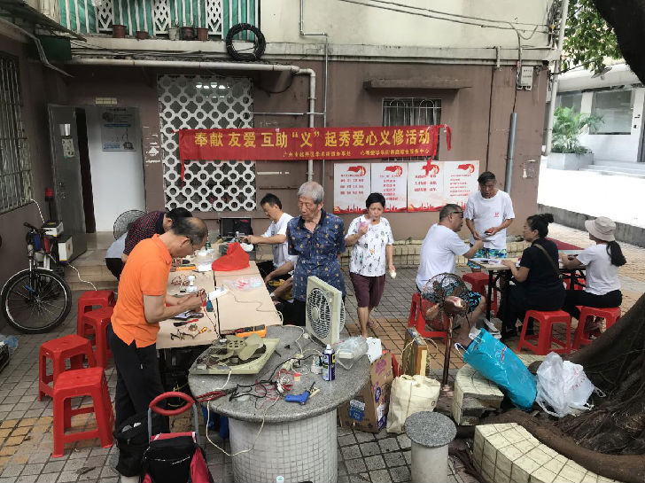 广州义工粤晖家电维修队义修活动深受社区居民的欢迎,结合广州市心明爱社会工作服务中心-华乐街家综构建社区…