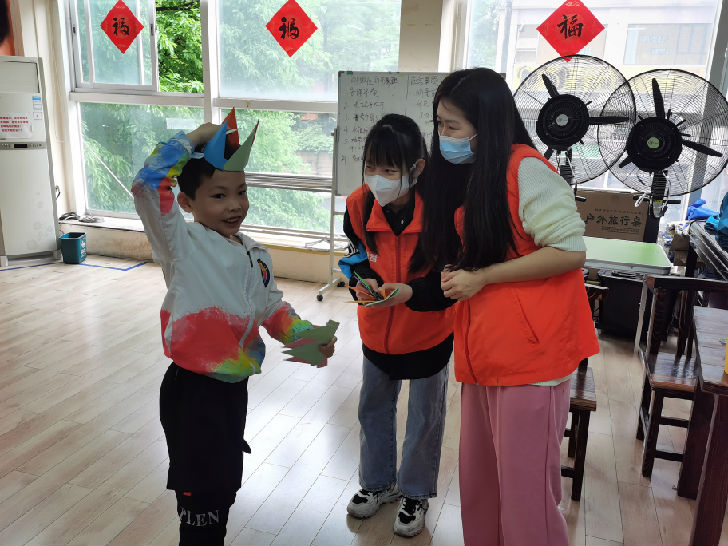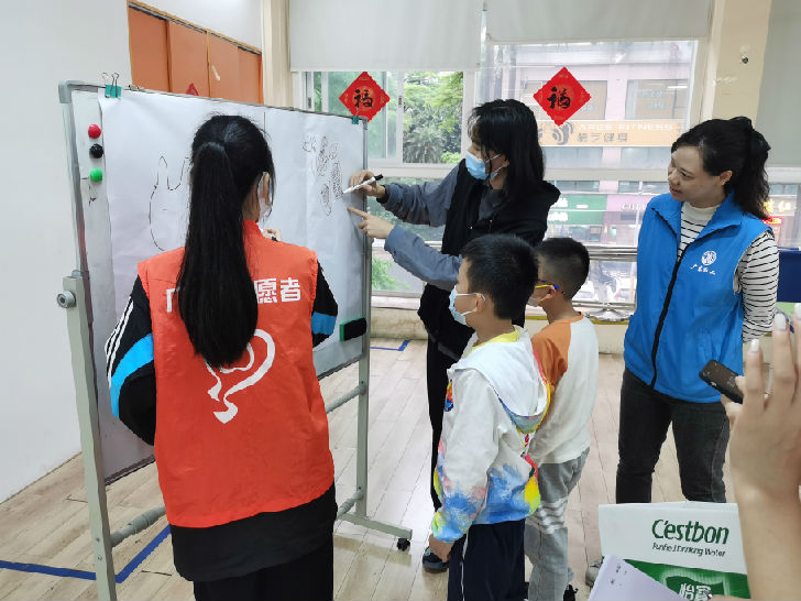 志愿者主持手工活动,家长与小朋友一起参与制作